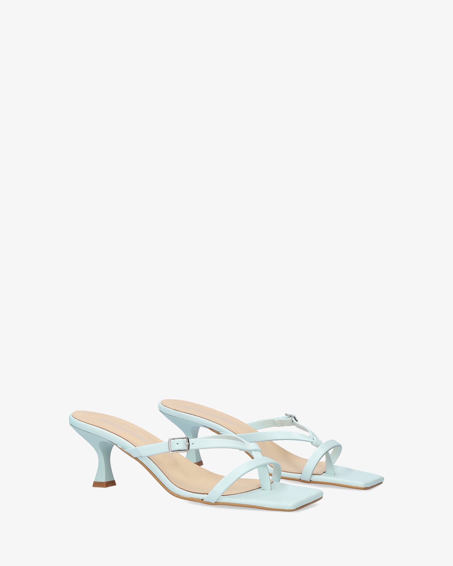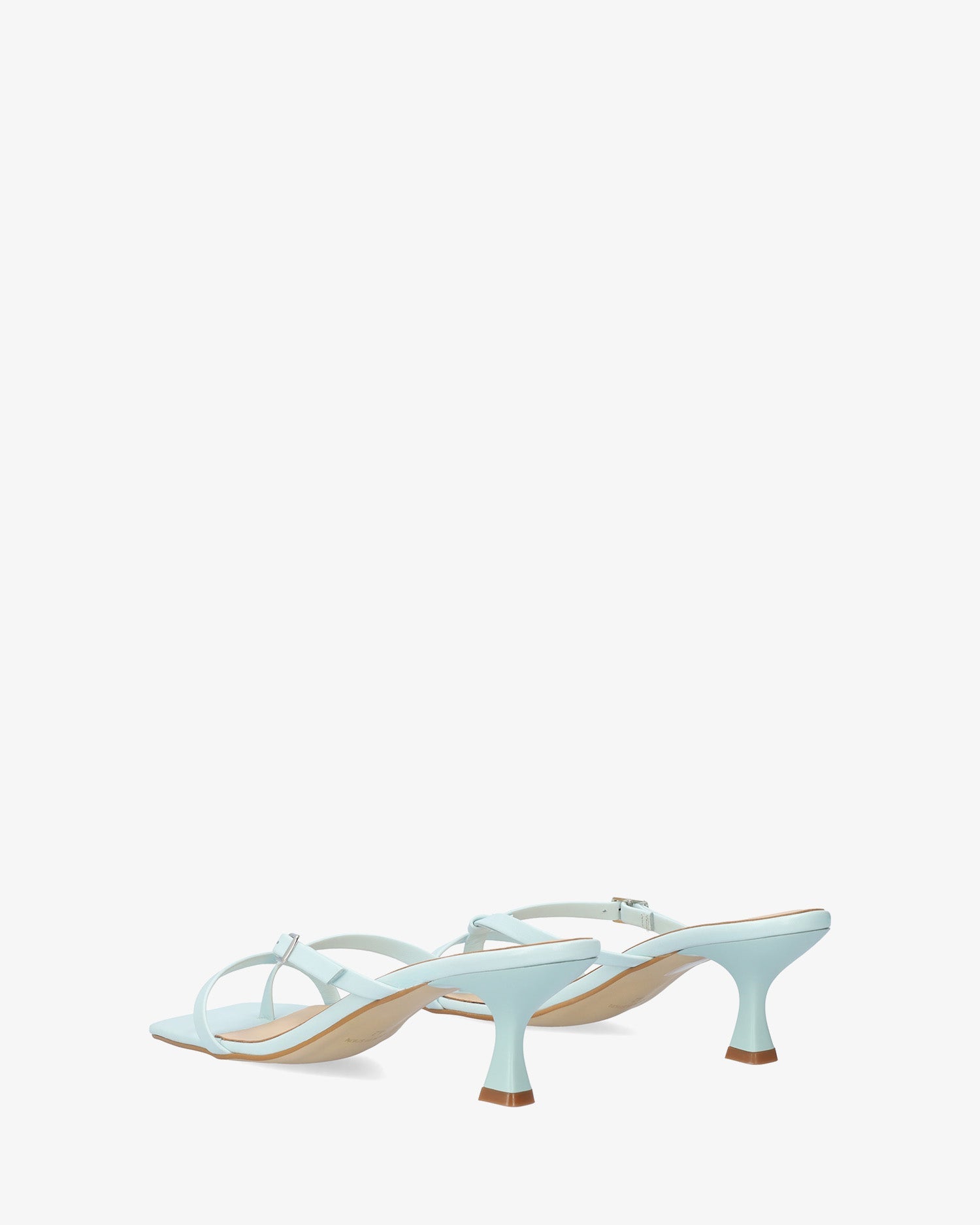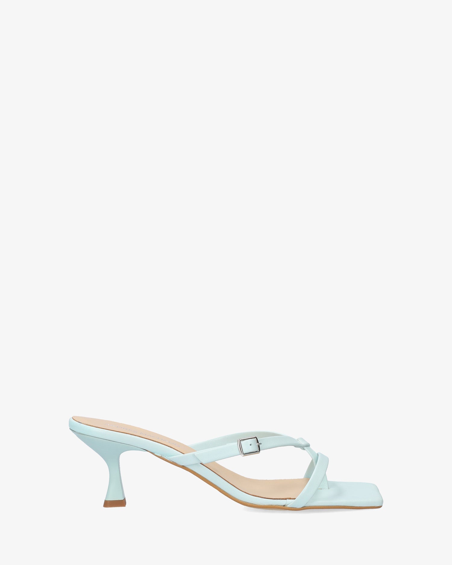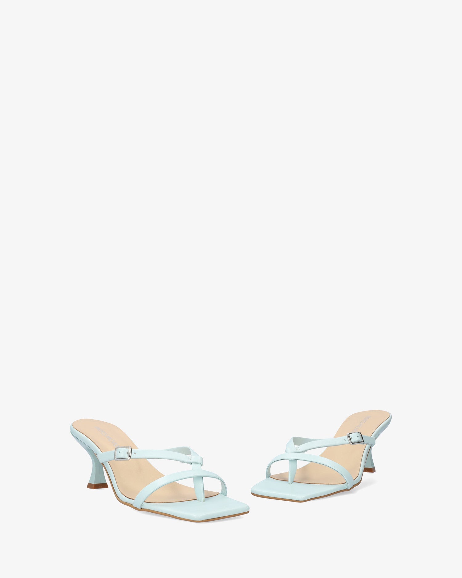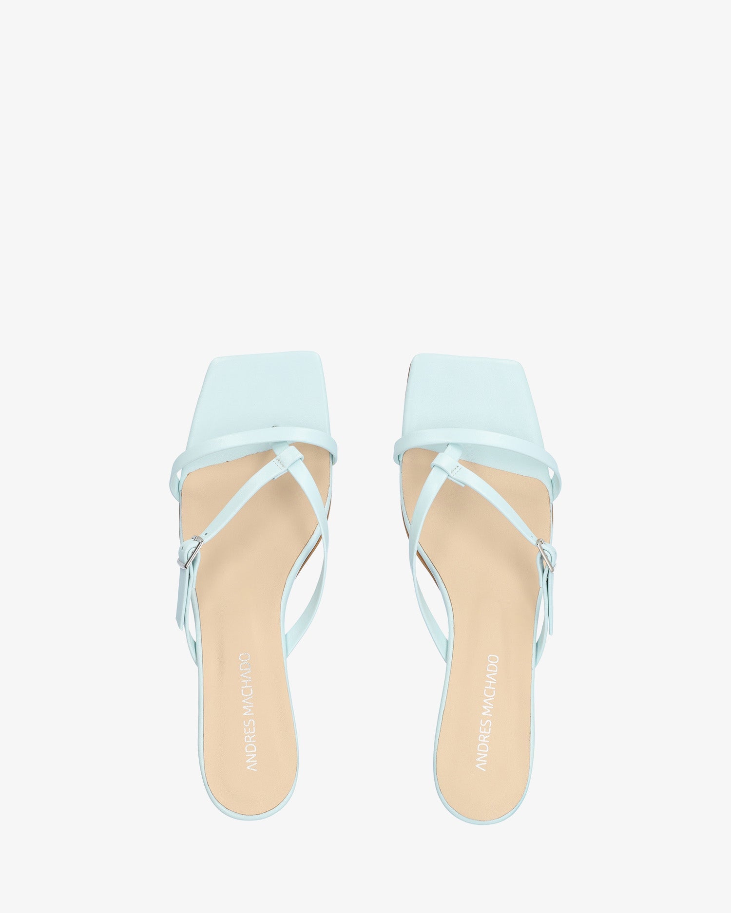 Sandalias de dedo con tacón Kitten Heel en piel de color azul. Diseño de tira fina en la parte delantera y tiras finas en forma de V invertida en el empeine al tono. Detalle con hebilla metálica en una de las tiras. Acabado en punta cuadrada. Tacón al tono de 7 cm de alto para las tallas pequeñas de la 32 a la 35. Tacón de 7,5 cm de alto para las tallas grandes de la 42 a la 45. Fabricado en España