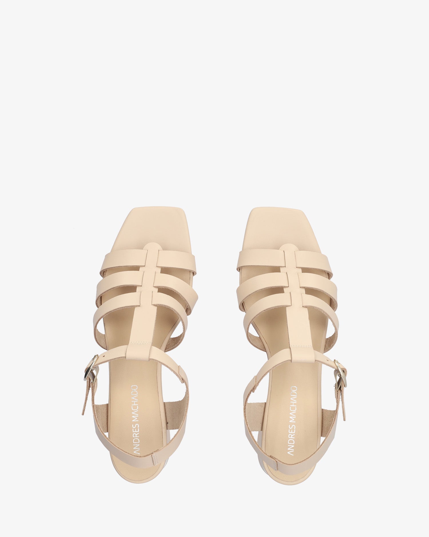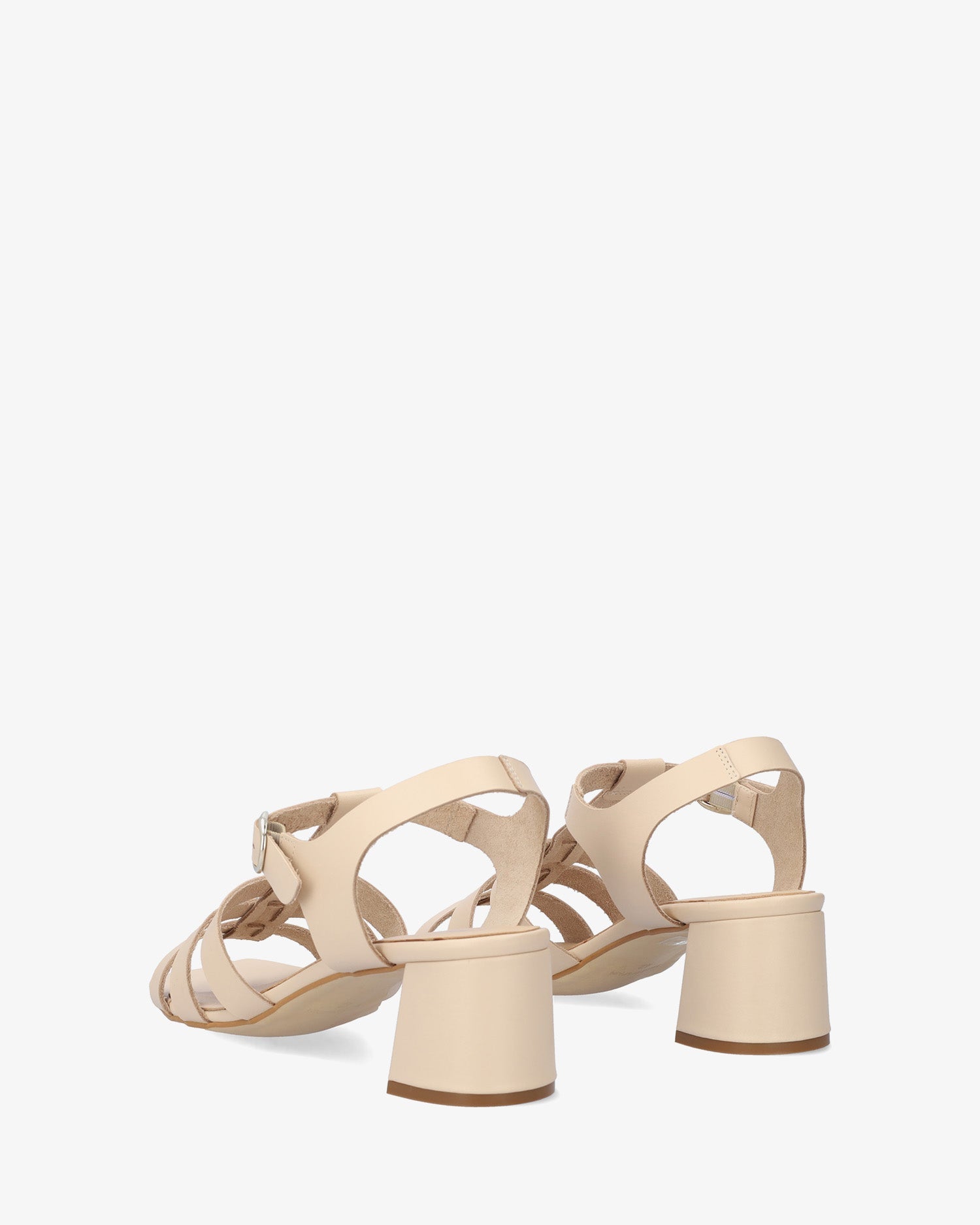 Sandalias con tacón redondeado en piel de color crema. Estilo T-Bar que se junta con tres tiras finas paralelas en la puntera y en el empeine al tono. Acabado en punta cuadrada. Cierre con hebilla metálica en el lateral. Tacón de 5,5 cm para las tallas pequeñas de la 32 a la 35. Tacón de 5,5 cm para las tallas medianas de la 36 a la 41. Tacón de 6 cm para las tallas grandes de la 42 a la 45. Fabricado en España
