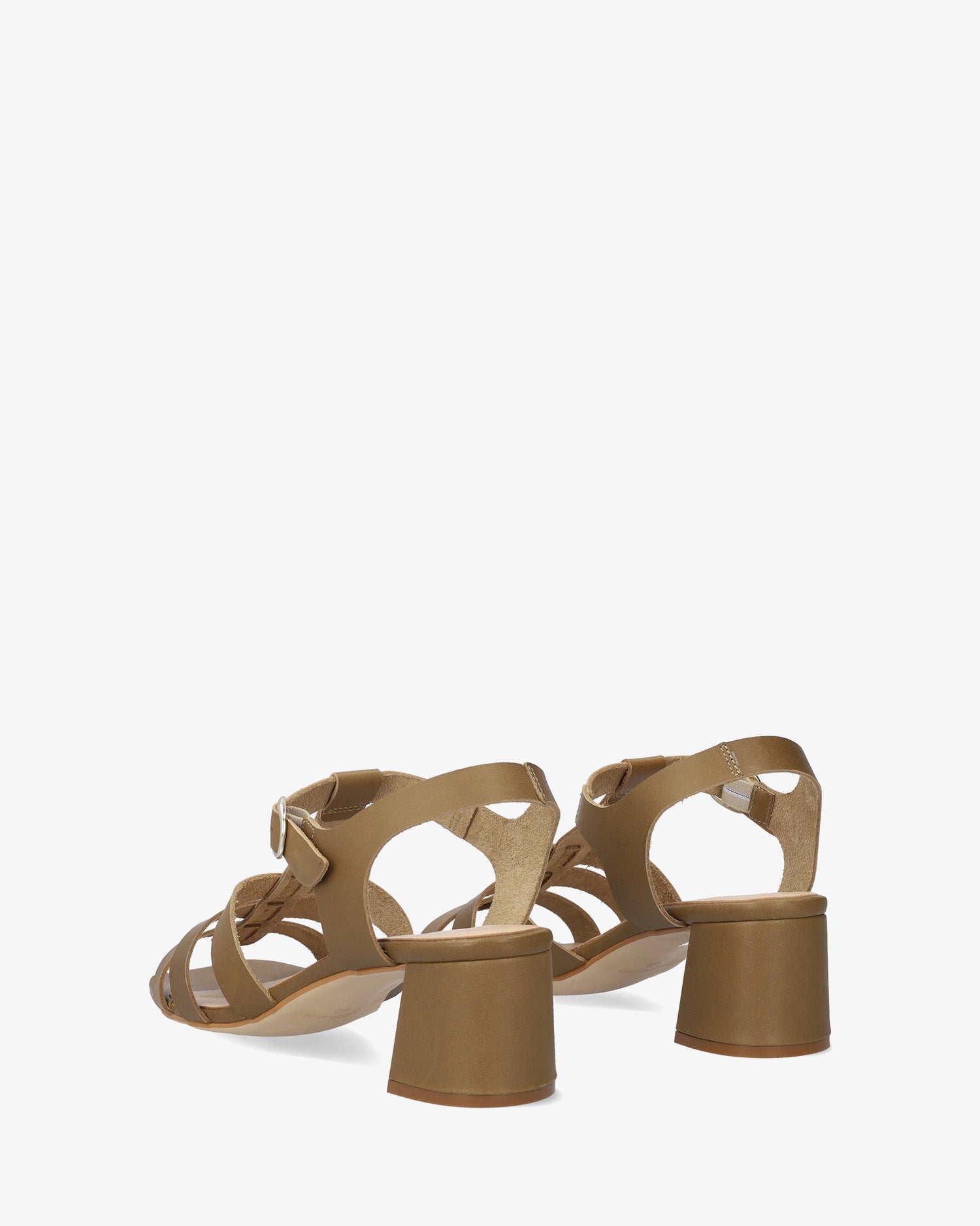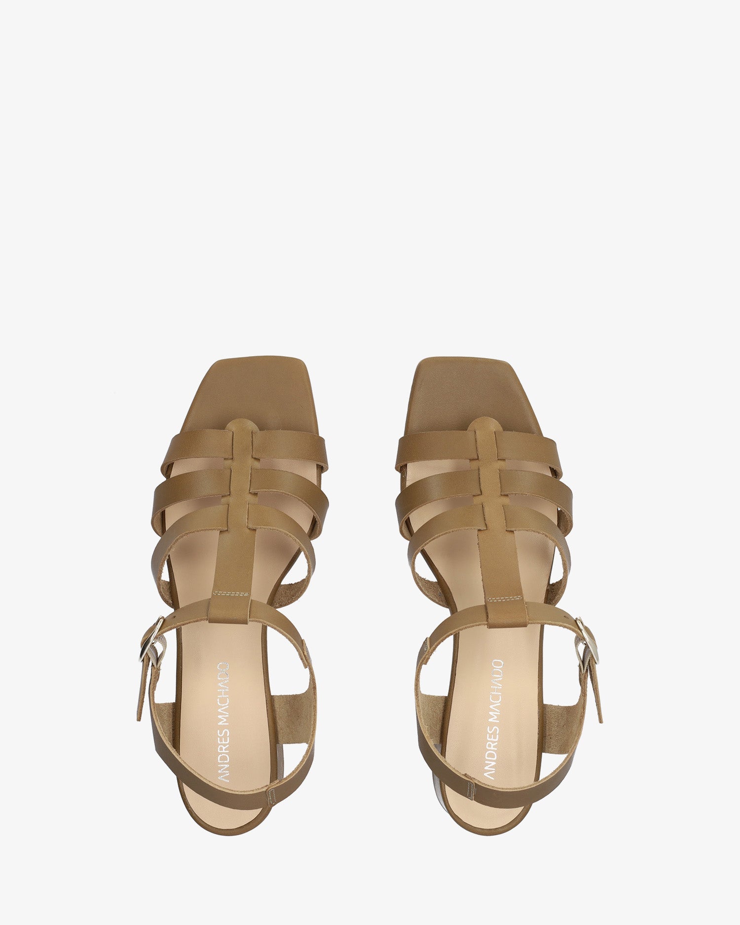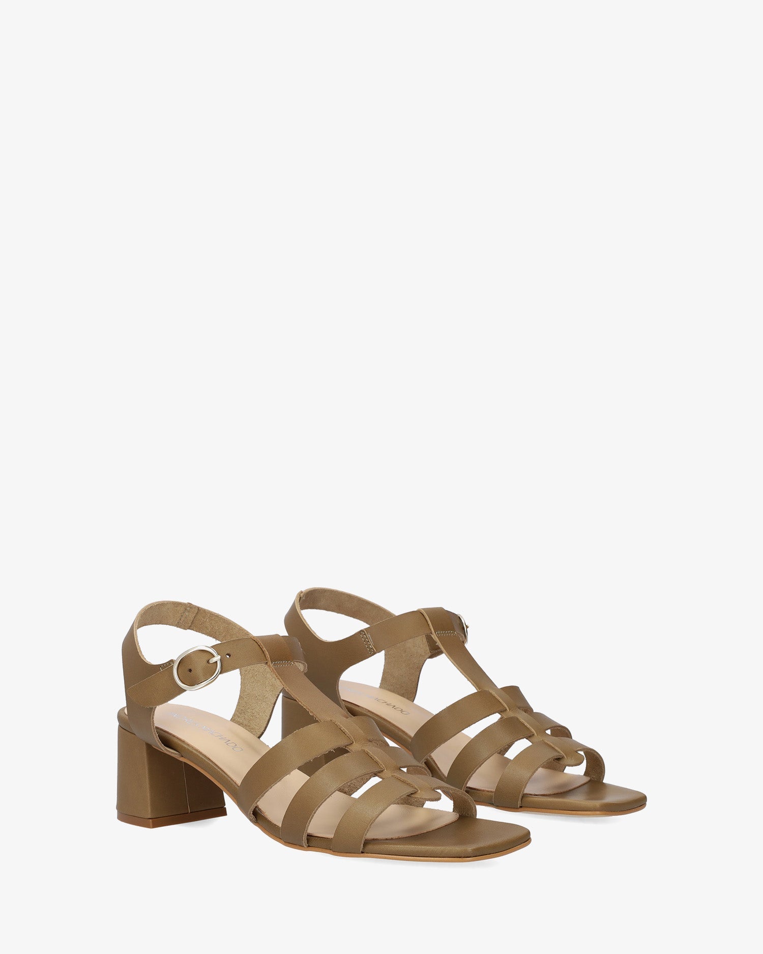 Sandalias con tacón redondeado en piel de color kaki. Estilo T-Bar que se junta con tres tiras finas paralelas en la puntera y en el empeine al tono. Acabado en punta cuadrada. Cierre con hebilla metálica en el lateral. Tacón de 5,5 cm para las tallas pequeñas de la 32 a la 35. Tacón de 5,5 cm para las tallas medianas de la 36 a la 41. Tacón de 6 cm para las tallas grandes de la 42 a la 45. Fabricado en España