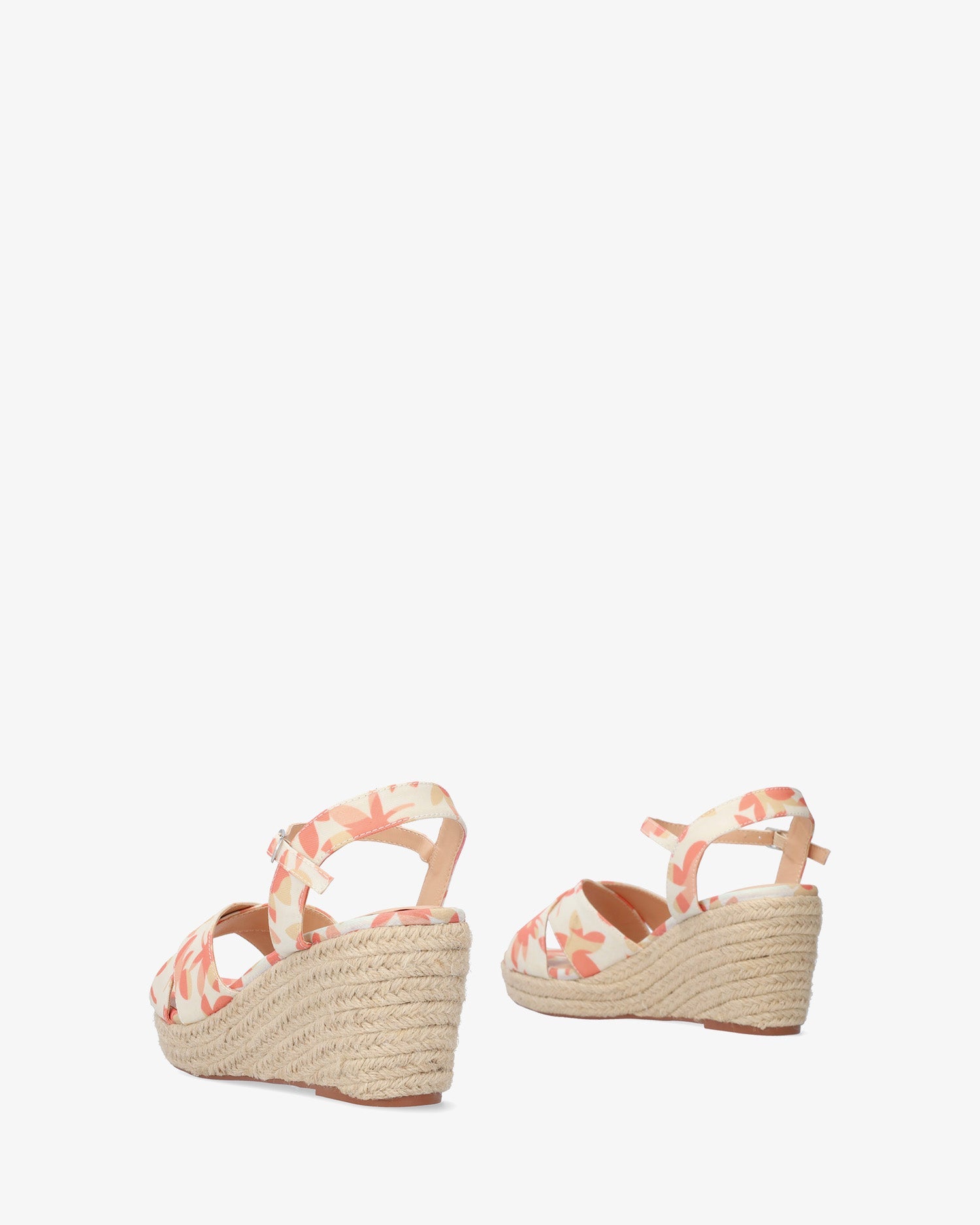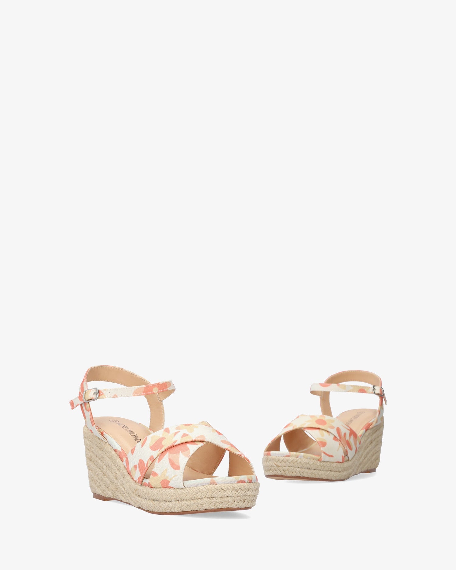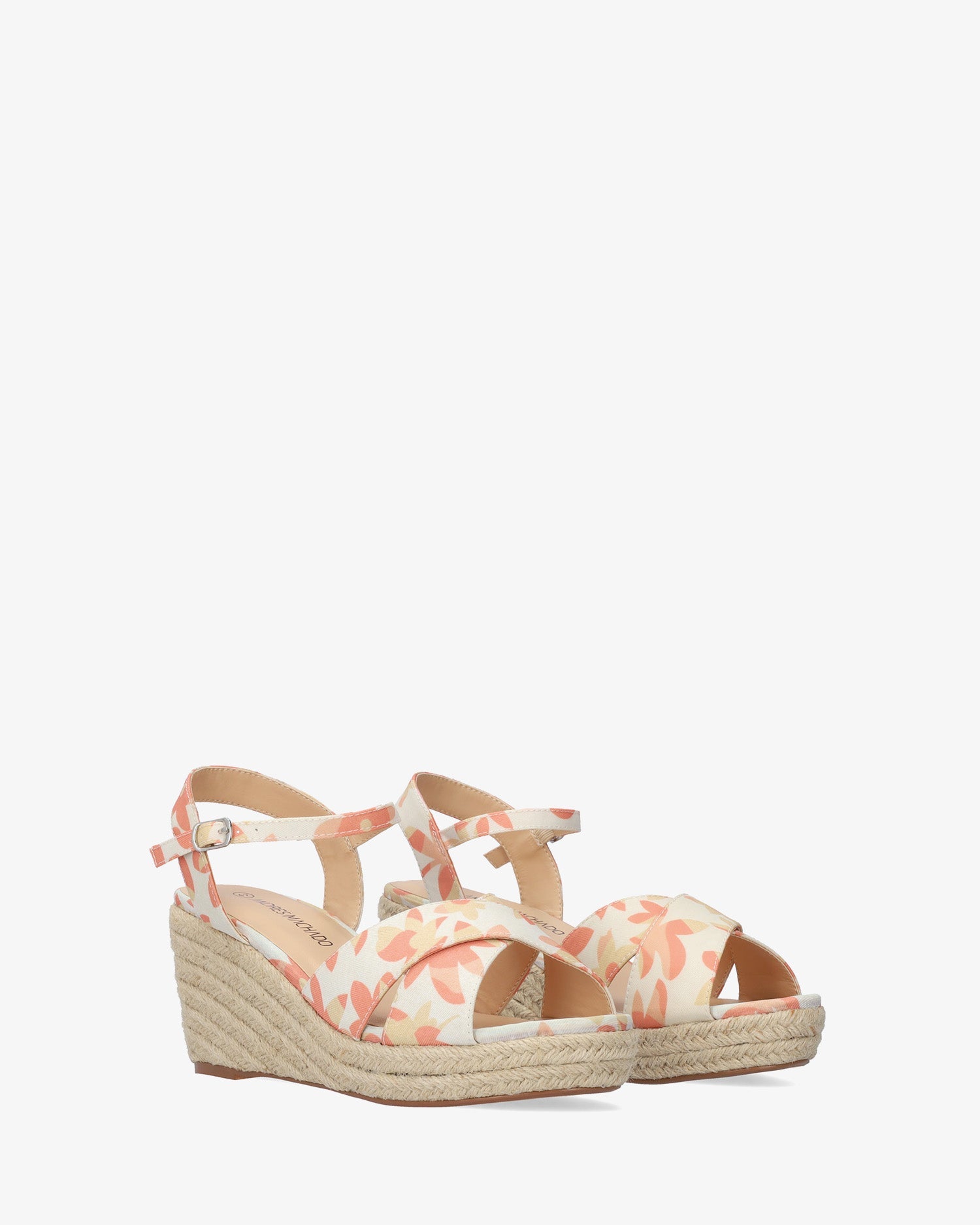Sandalias con cuña en tejido con motivos florales anarajandos. Diseño destalonado con tira al talón. Punta abierta y redonda con tiras anchas cruzadas en la parte delantera. Cierre de hebilla metálica con pulsera al tono en el tobillo. Cuñas y plataforma delantera en yute. Cuña de 7 cm y plataforma de 2 cm para las tallas pequeñas de la 32 a la 35. Cuña de 8,5 cm y plataforma de 2,5 cm para las tallas grandes de la 42 a la 45.
