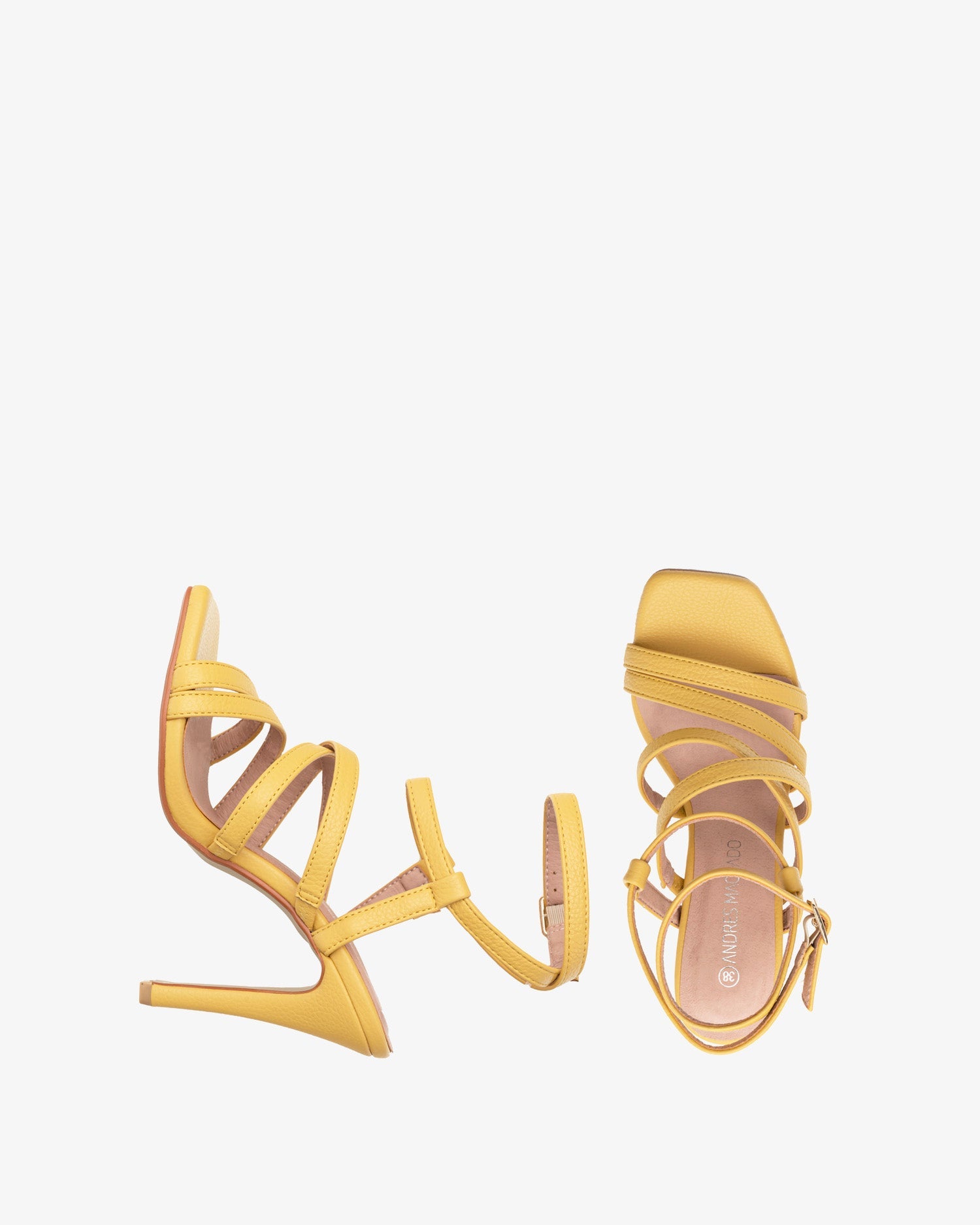 Sandalias en soft de color Amarillo. Diseño de multitiras finas al tono en la puntera y cruzadas en el empeine. Cierre mediante hebilla de pulsera cruzada en el empeine y envolvente en el tobillo. Puntera cuadrada y abierta. Tacón fino forrado al tono de 9 cm para las tallas pequeñas de la 32 a la 35. Tacón de 11,5 cm para las tallas grandes de la 42 a la 45.