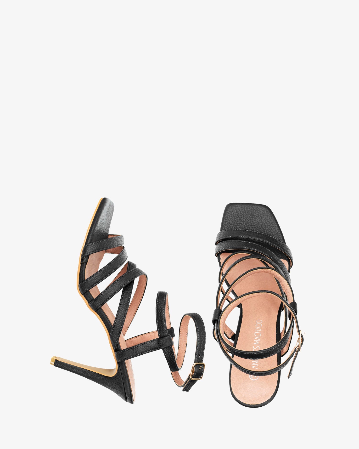 Sandalias en soft de color Negro. Diseño de multitiras finas al tono en la puntera y cruzadas en el empeine. Cierre mediante hebilla de pulsera cruzada en el empeine y envolvente en el tobillo. Puntera cuadrada y abierta. Tacón fino forrado al tono de 9 cm para las tallas pequeñas de la 32 a la 35. Tacón de 11,5 cm para las tallas grandes de la 42 a la 45.