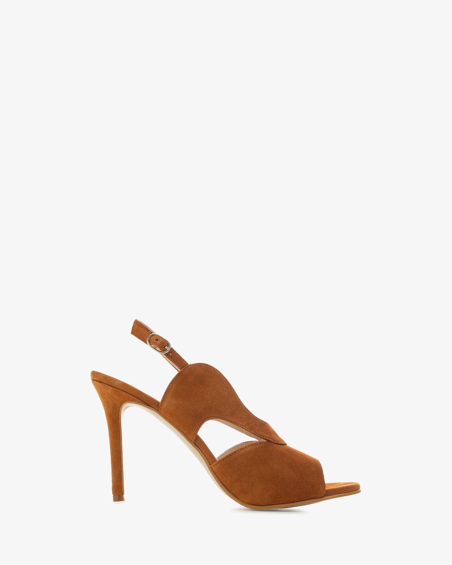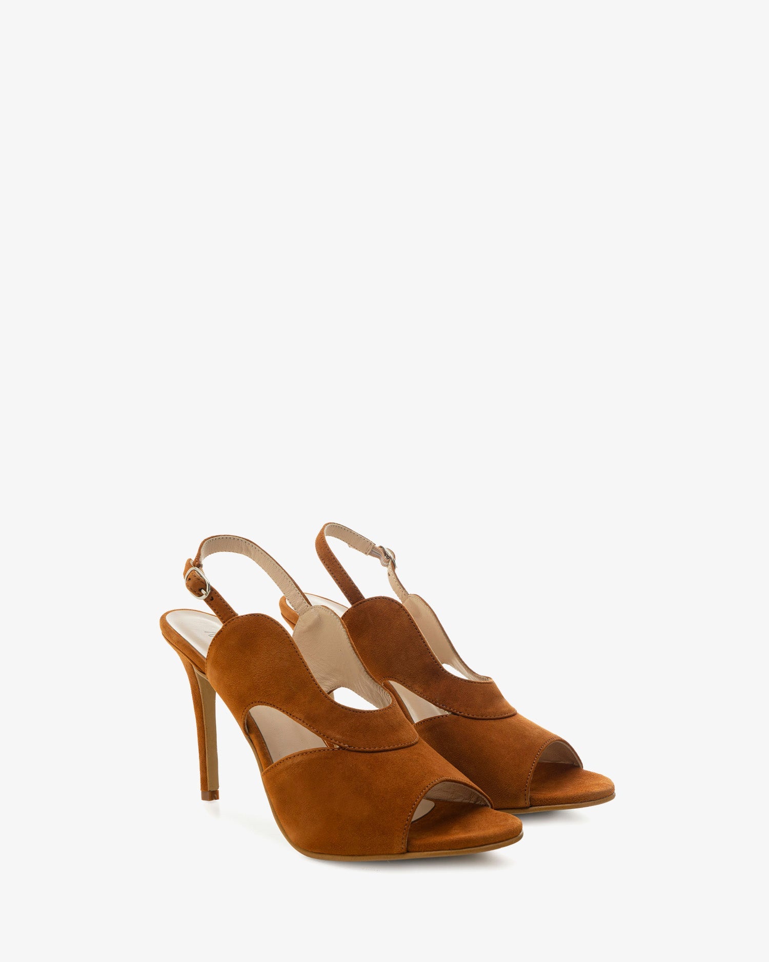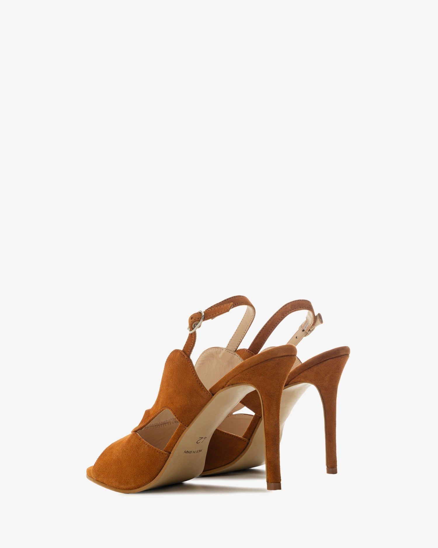 Sandalias destalonada en Ante de color teja. Tira ancha con forma de ondas alrededor el empeine. Tira trasera con cierre de hebilla lateral. Forro interior en Piel. Tacón fino de aguja forrado al tono de 10,5 cm para las talla pequeñas de la 32 a la 35. Tacón Fino forrado al tono de 11,5 cm para las tallas grandes de la 42 a la 45. Fabricado en España