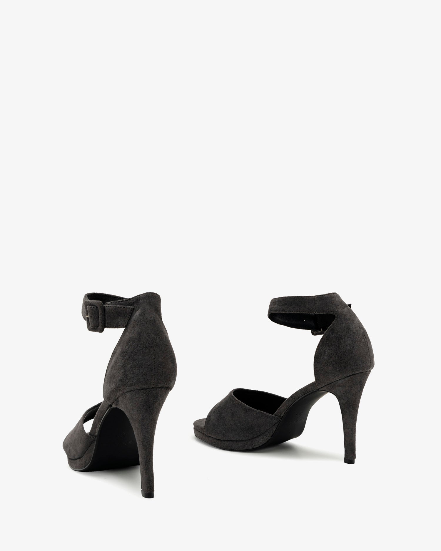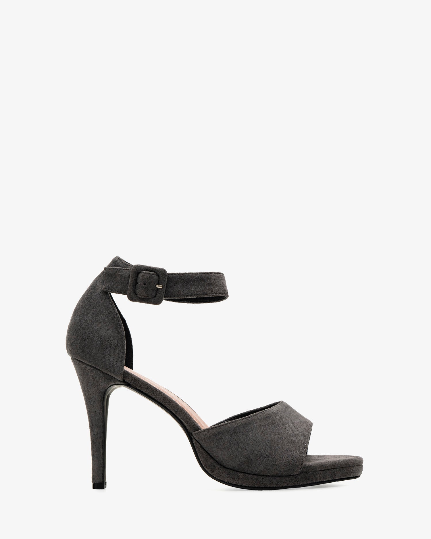 Sandalia en símil ante de color Gris. Diseño de tira ancha al tono en la puntera. Cierre de hebilla con pulsera ancha al tono alrededor del tobillo. Talonera forrada al tono. Tacón fino de 8 cm y mini plataforma delantera de 1 cm ambas en símil ante de color gris para las tallas pequeñas de la 32 a la 35. Tacón fino de 10,5 cm y mini plataforma delantera de 1 cm para las tallas grandes de la 42 a la 45.