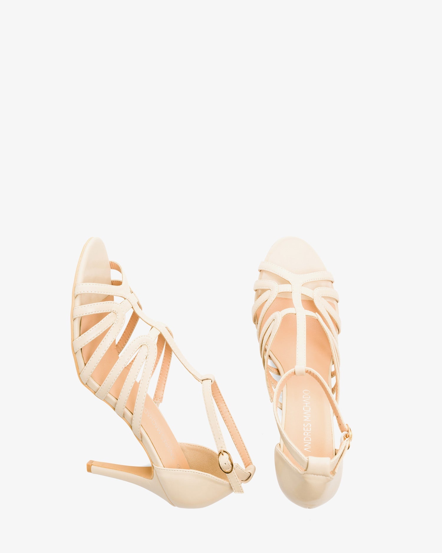 Sandalia T-Bar de tacón en soft color Crema con tiras finas en el empeine con puntera abierta al tono. Cierre de hebilla con pulsera al tobillo y talonera cubierta al tono. Tacón fino en soft al tono de 9 cm de alto para las tallas pequeñas de la 32 a la 35. Tacón de 10,5cm de alto para las tallas grandes de la 42 a la 45.