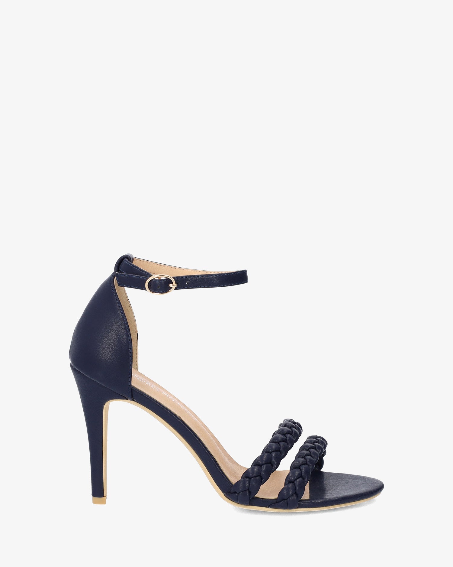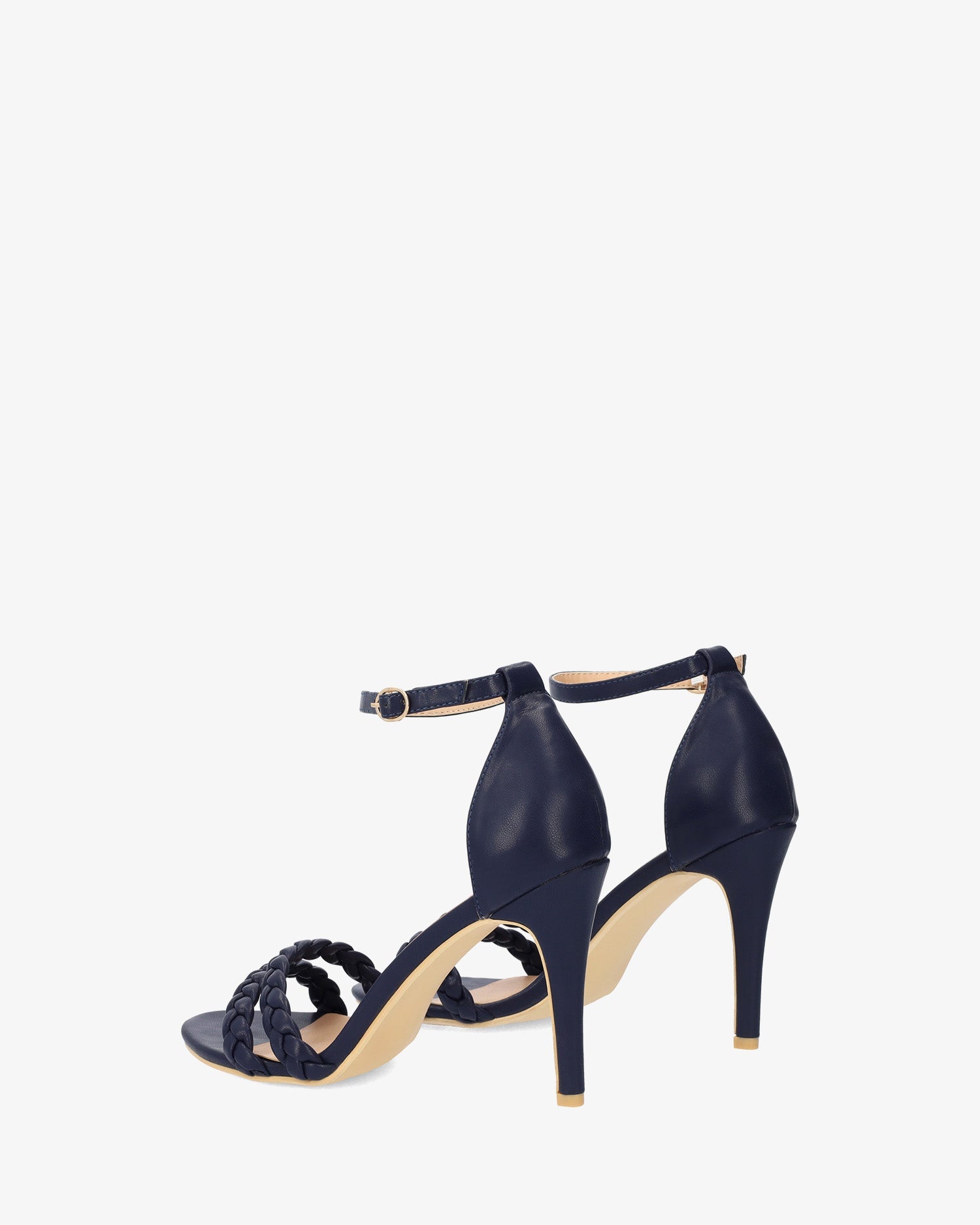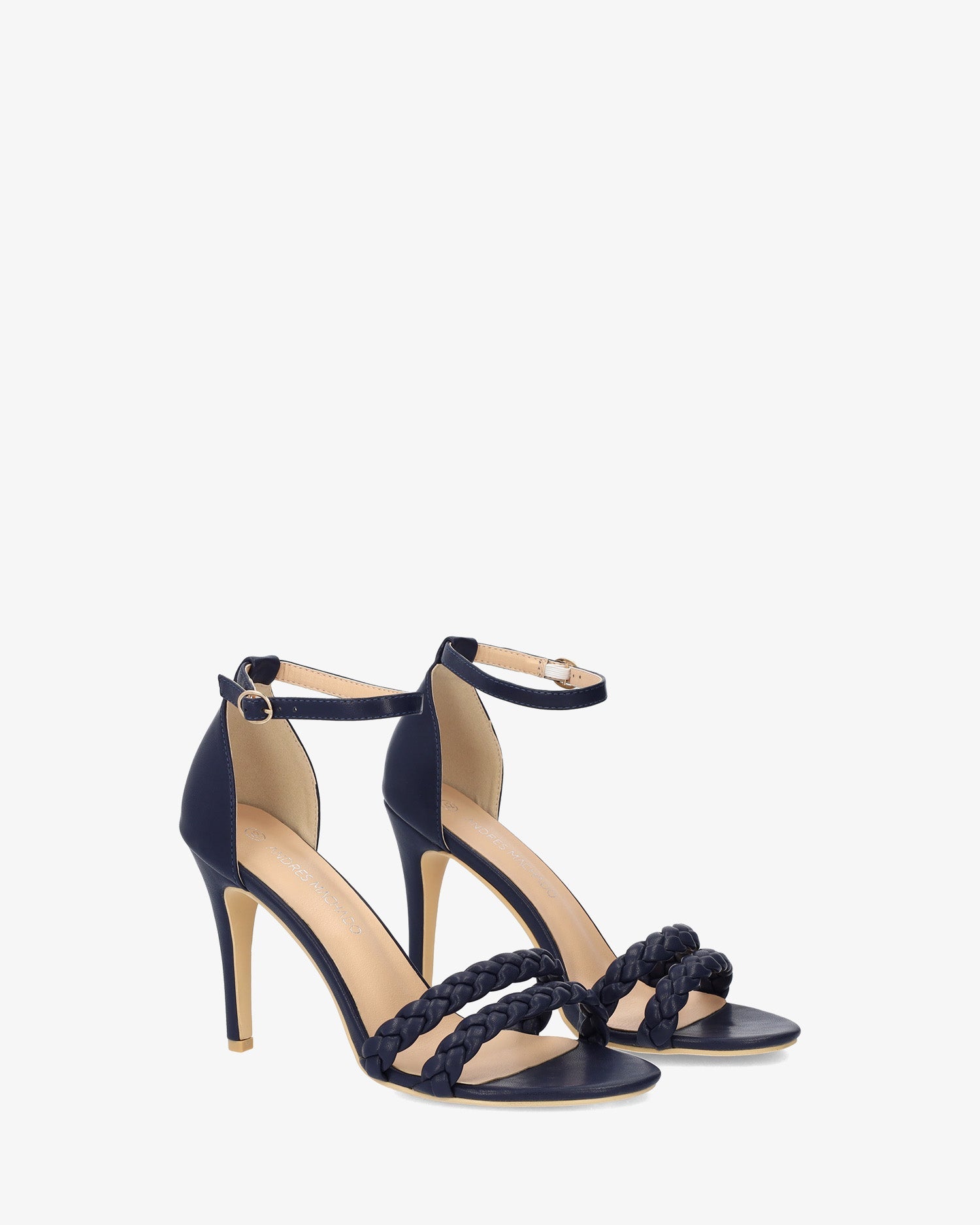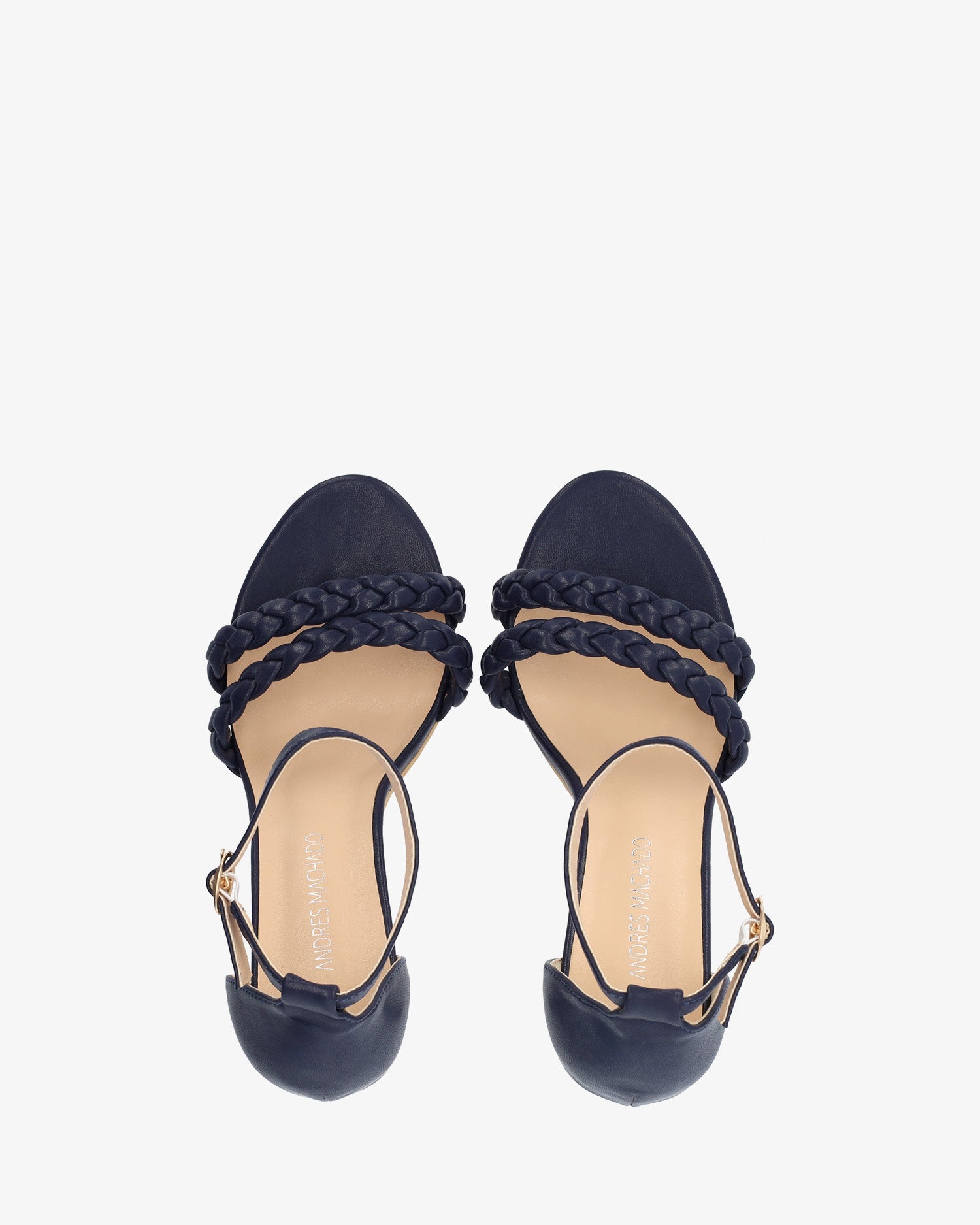 Sandalia de tacón en soft color Marino con dos tiras trenzadas y paralelas en la puntera abierta al tono. Cierre de hebilla con pulsera al tobillo y talonera cubierta al tono. Tacón fino en soft al tono de 9 cm de alto para las tallas pequeñas de la 32 a la 35. Tacón de 10,5cm de alto para las tallas grandes de la 42 a la 45.