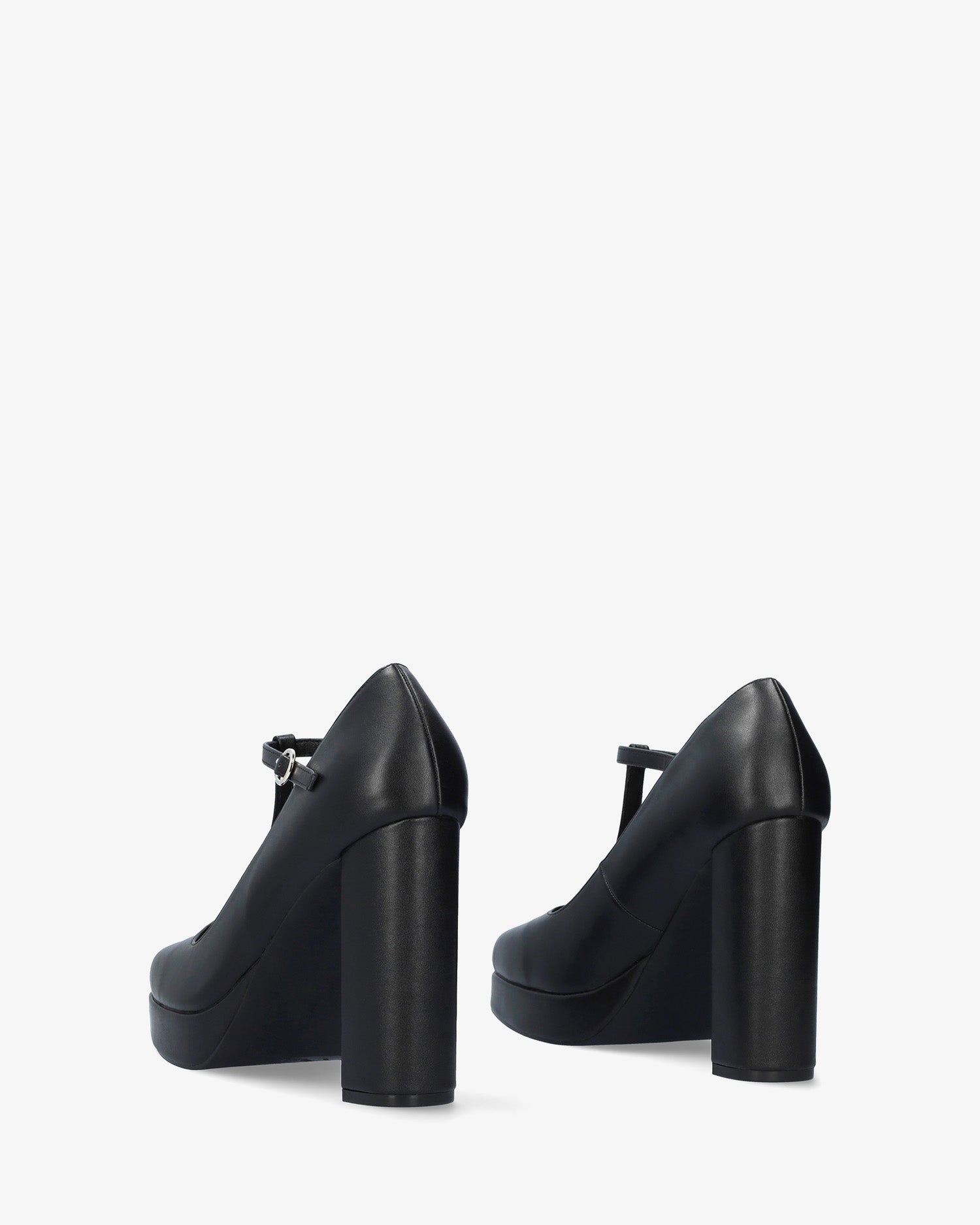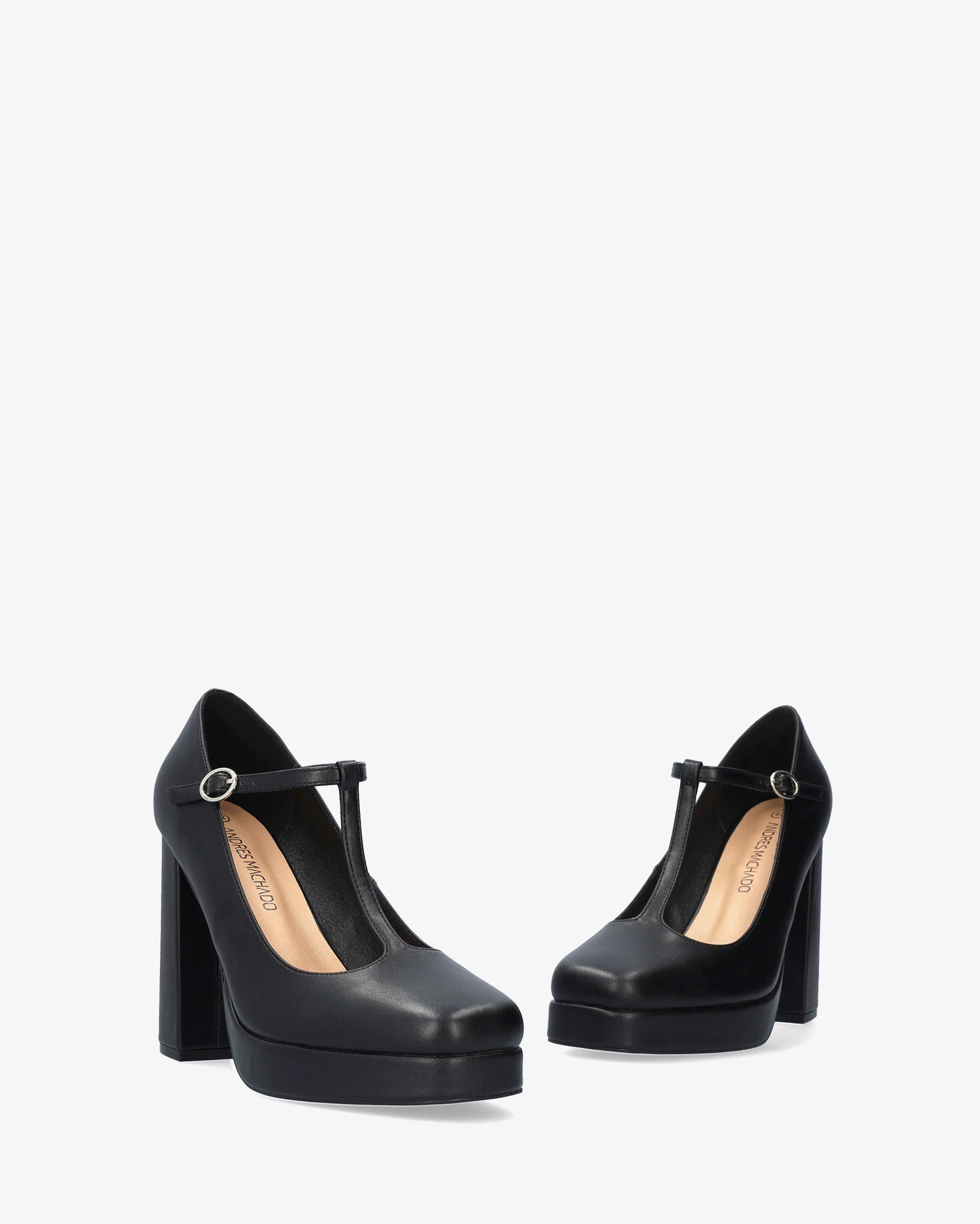 Zapato estilo Salomé acabado en punta cuadrada con tira central en T invertida sobre empeine. Tacón de 11 cm y plataforma de 2 cm para las tallas pequeñas de la 32 a la 35 y tacón de 12,5 cm y plataforma de 2,5 cm para las tallas grandes de la 42 a la 46.