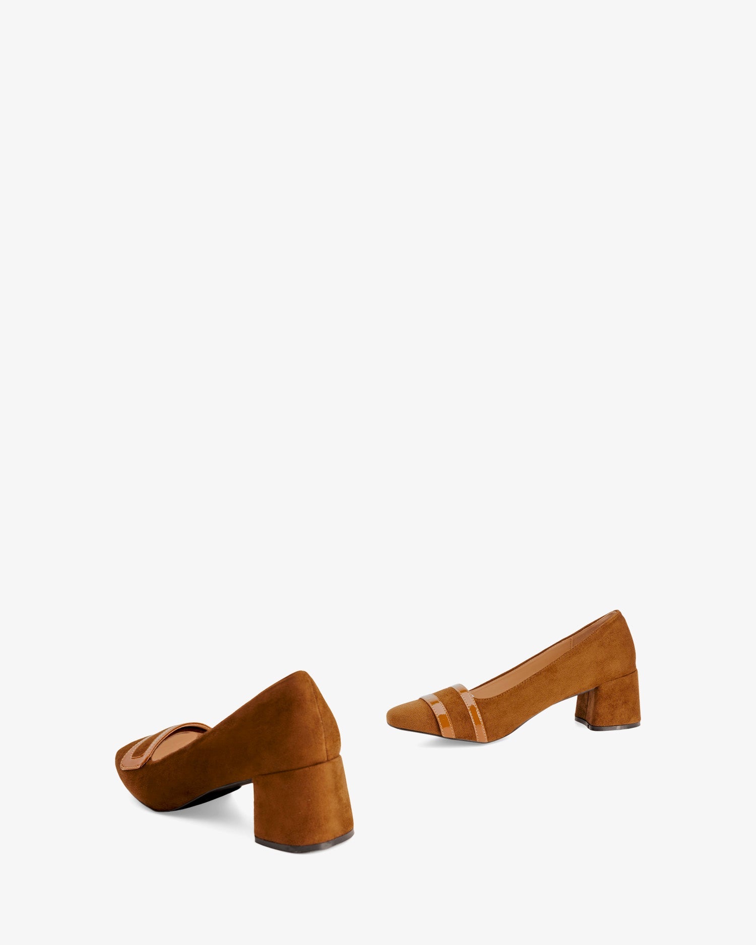 Zapato en ante de color camel. Detalle de tiras en charol al tono en forma de rectangulo en la puntera. Acabado en punta cuadrada. Tacón ancho forrado al tono de 5,5 cm para las tallas pequeñas de la 32 a la 35. Tacón de 5,5 cm para las tallas grandes de la 42 a la 45. Este modelo puede tener una variación de medidas respecto al estandar, te recomendamos que revises los cms de la plantilla o suela interior.
