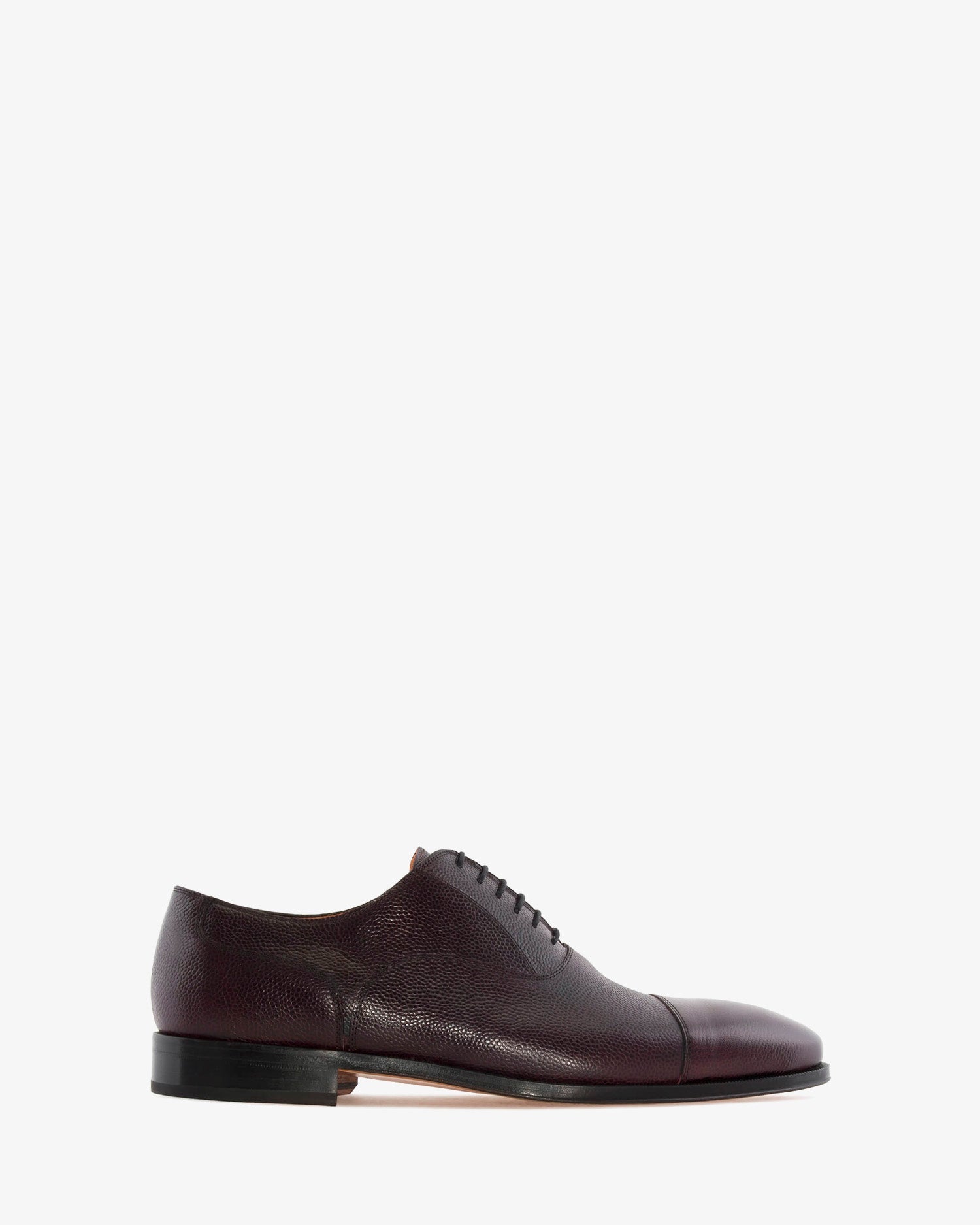 Zapatos de Caballero Estilo Oxford en Piel Grabado Marron Burdeos en el corte con cierre de cordones al tono. Pespuntes en hilo del mismo color. Forro interior de cuero Naranja. Suela de piel. Fabricación Española. Tallas Grandes de Caballero de la 47 a la 50.
