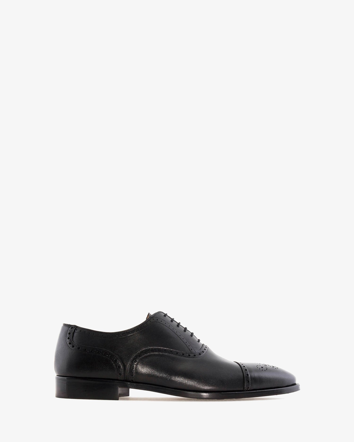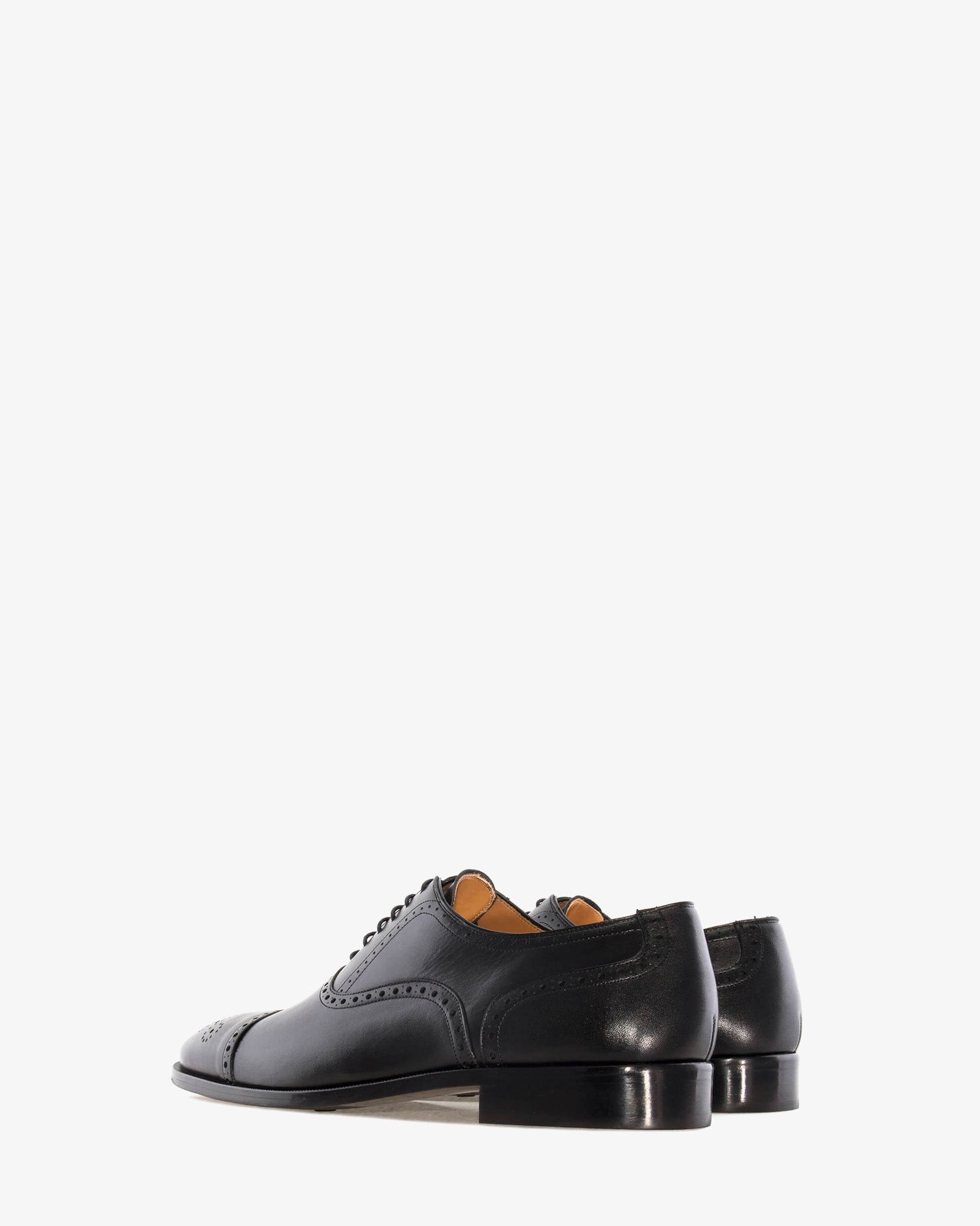 Zapatos de Caballero Estilo Oxford en Piel Negro con cierre de cordones al tono. Picados en el empeine y en los laterales caracteristicos de dicho estilo. Forro interior de cuero Camel. Suela de piel color Negro. Fabricación Española. Tallas Grandes de Caballero de la 47 a la 50.